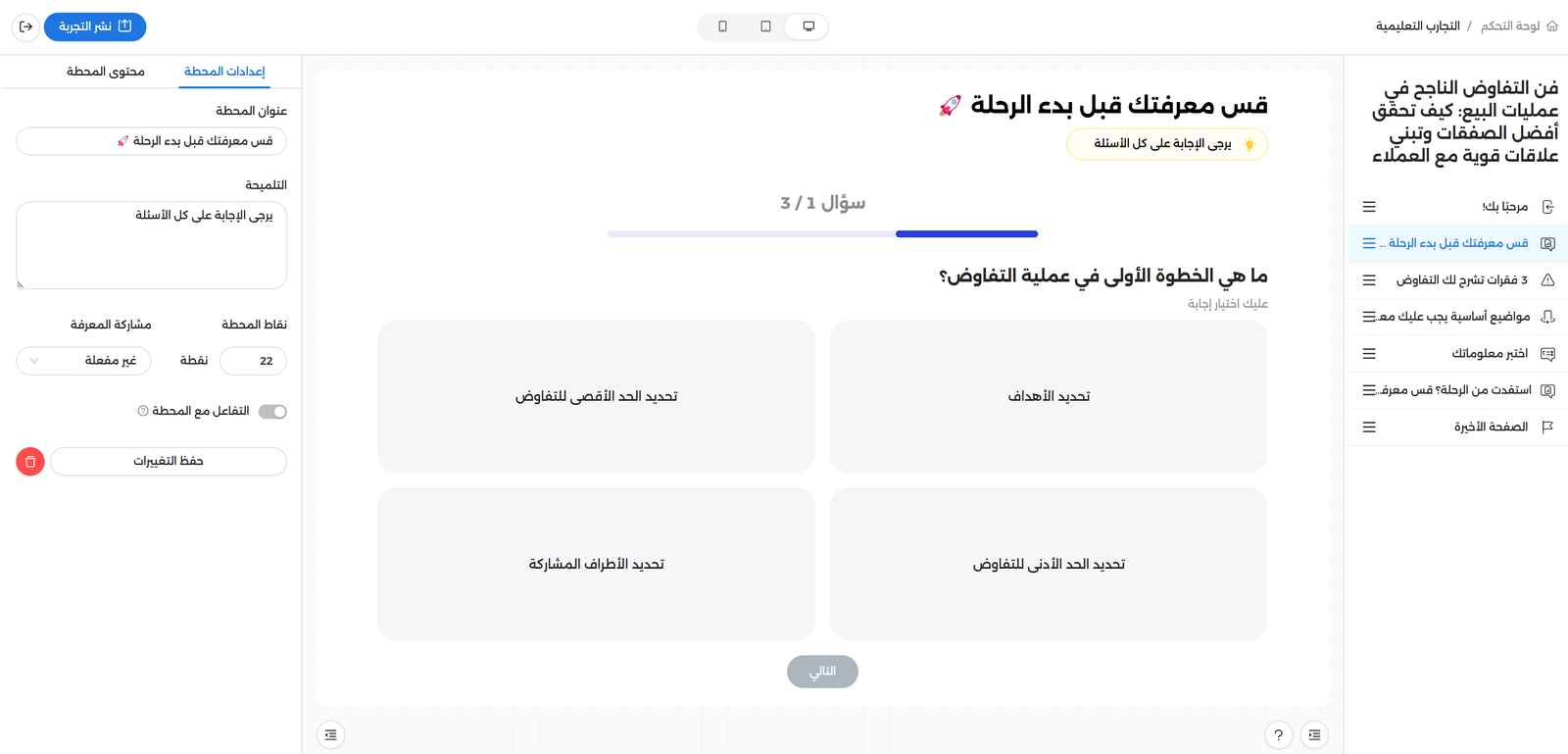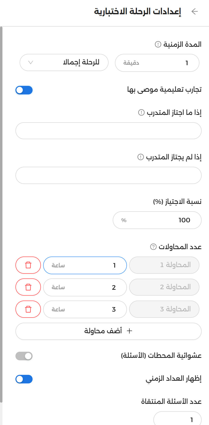 تتفاوت مستويات المتدربين داخل المنصة التعليمية، ويمكن اكتشاف ذلك بشكلٍ جلي من تفاوت درجاتهم ونتائجهم بآليات التقييم المختلفة المتوفرة داخل المنصة، وعلى رأسها الرحلة الاختبارية، ماذا لو قمنا بتخصص التجارب التعليمية المقترحة التالية لهم بناءً على درجاتهم ونتائجهم بنهاية الرحلة الاختبارية؟ تعزيزًا لتعليمٍ تكيفيّ شخصيّ أكثر فعالية؛ الآن يمكنك تحديد تجارب تعليمية محددة تظهر للمتدرب بنهاية رحلته الاختبارية وفقًا لحالة اجتيازه ونتيجته بالرحلة الاختبارية، ليتوجه إلى تجارب تعليمية محددة متوافقه مع مستواه وحصيلته المعرفية المستكشفة ضمنيًا من نتيجته بالرحلة الاختبارية.