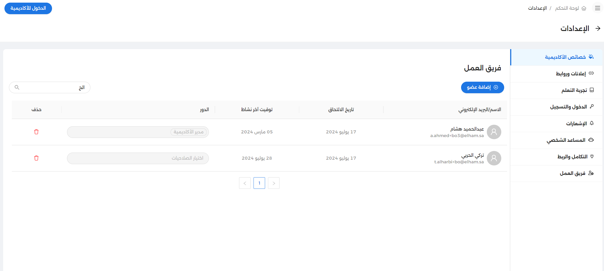 كلما زاد عدد المتدربين زاد طرديًا حجم محتوى البرامج التعليمية وزادت المجموعات وأحجامها والتجارب التعليمية والمهام التدريبية وغيرها من عناصر ومكونات تجربة التعلم بشكلٍ تلقائي؛ مما يجعل إدارة الاكاديمية بشكلٍ منفرد أمر صعب وشاق، وهذا يؤدي بالضرورة إلى دعوة فريق عمل يكن بمثابة طاقم إداري منظم ومتكامل لإدارة الاكاديمية وتسيير أمورها وتيسير الكثير من الأشياء على المتدربين والمستفيدين من المنصة. تجد في صفحة فريق العمل داخل صفحة الإعدادات بلوحة التحكم القادرة على التحكم في قوام الفريق وعدده وأدوار كل فردٍ فيه بما يتوافق مع الأدوار المطلوبة منه، فبإمكانك إسناد أي دور من الأدوار مسبقة التعريف داخل الأكاديمية والملقنة بصلاحياتٍ محددة إلى أي منتسب للأكاديمية لكي يترقى حسابه بناءً على صلاحيات هذا الدور الجديد له، ومن ثم بإمكانه المساعدة في نطاق مسؤولياته مثل إضافة تجارب تعليمية أو تصحيح المهام أو إضافة المتدربين أو غيرها من الصلاحيات التي تحتاج إلى فريق عمل دؤوبٍ ومتعاونٍ ومتكاتف.