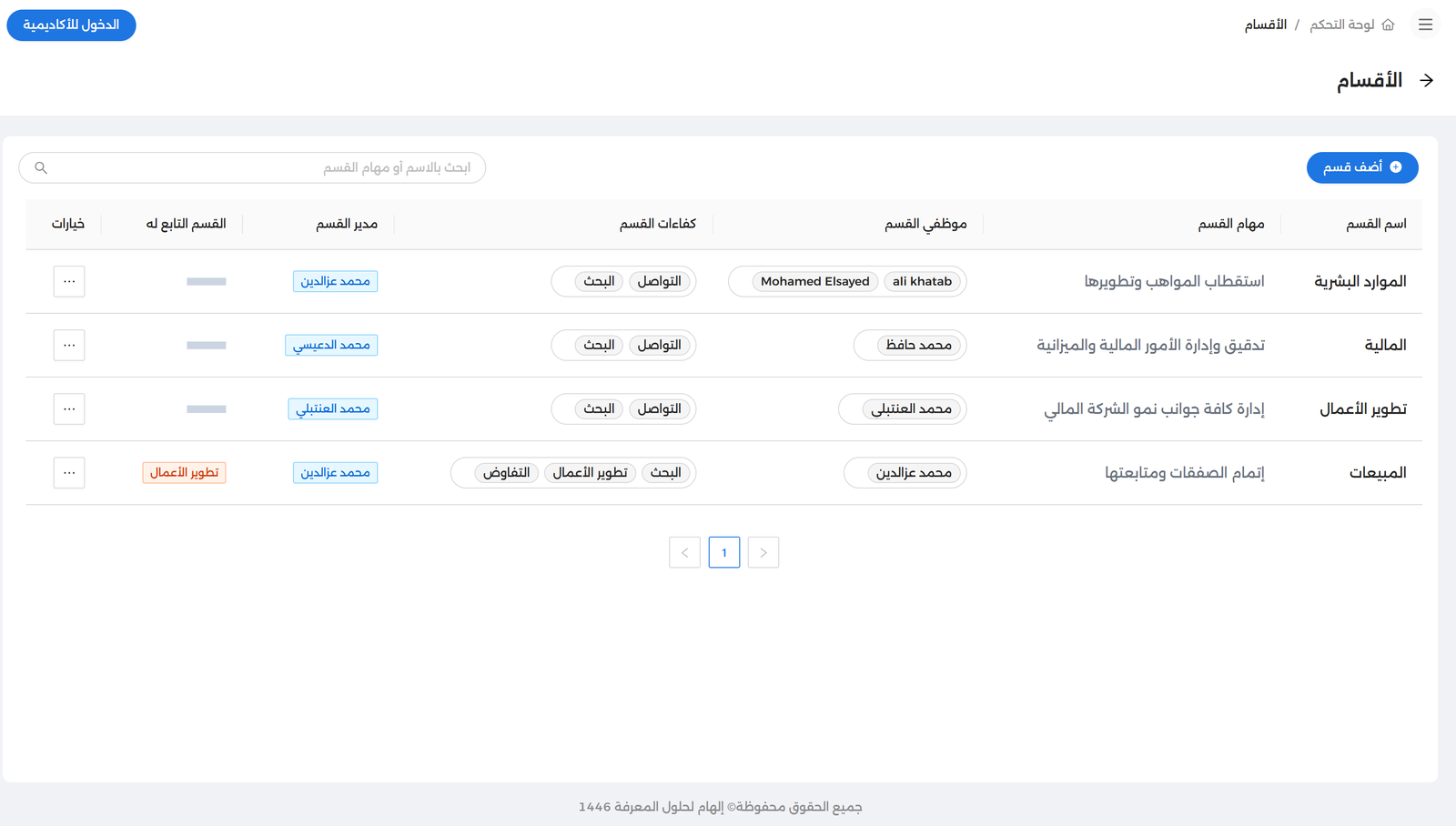 الآن أصبح بإمكانك عبر صفحة "الأقسام" الجديدة من إضافة الأقسام المختلفة لمنظمتك داخل منصتك التعليمية، ويمكنك عبر هذه الإضافة من محاكاة التسلسل الهرمي لإدارة تلك الأقسام وتبعيتها، من خلال تحديد القسم التابع له أي قسم آخر بشكلٍ اختياريّ، وكذلك بإمكانك تعيين مدير لكل قسم من الموظفين المضافين داخل منصتك التعليمية، فضلًا عن تحديد المهام الوظيفية لكل قسم وكفاءاته المستهدف تطويرها لموظفي تلك الأقسام، وفور اختيار تلك الكفاءات المستهدفة، يتم إسناد كافة التجارب التعليمية المقترنة بتلك الكفاءات بشكلٍ تلقائي.
