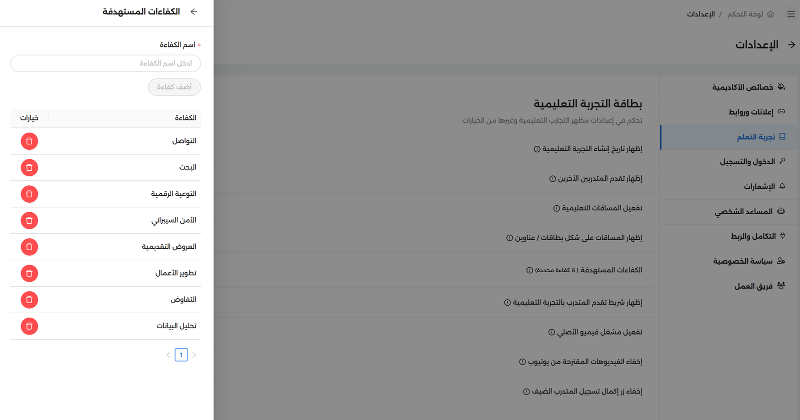 لكل تجربة تعليمية هدف معرفي، ولكل هدف معرفي كفاءة كبرى يتبعها، قد تكون تلك الكفاءة متمثلة في مهارات التفكير التصميمي أو التواصل أو البحث أو حتى الإنتاجية؛ تتيح لك منظومة الكفاءات من ضبط وتوجيه كل تجاربك التعليمية داخل منصتك التدريبية نحو أهدافك المعرفية ومن وراءها الكفاءات التي تمثل تصنيفات واضحة لكل المحتويات التدريبية داخل المنصة، يمكنك إضافة كافة الكفاءات التي تتبناها داخل منصتك التعليمية، ومن ثم إلحاقها بالتجارب التعليمية المناسبة لها، وعند إسناد تلك الكفاءات إلى أقسامٍ محددة، تُسند كل التجارب المنتمية لتلك الكفاءات إلى هذا القسم بشكل مؤتمت.