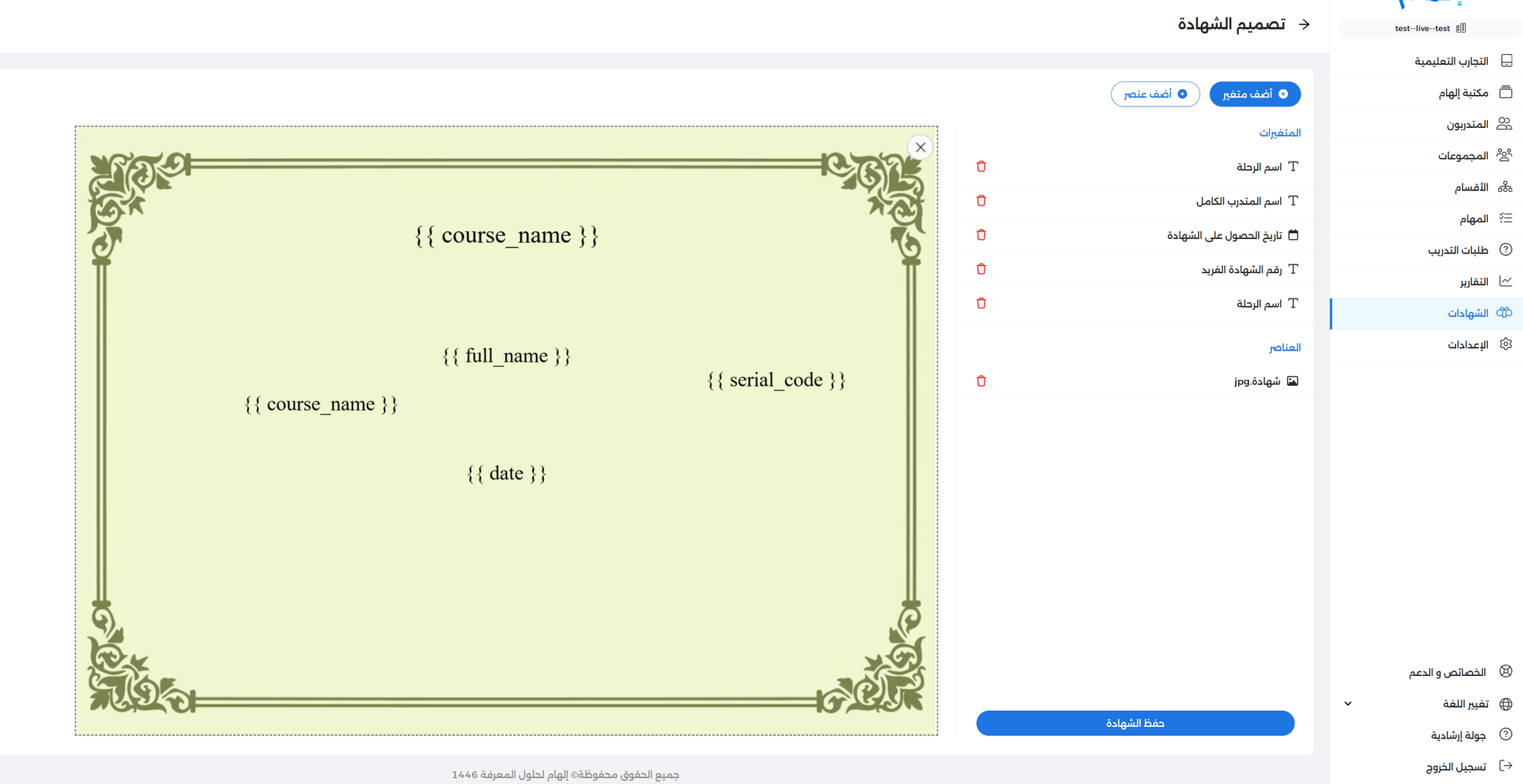 تعتبر الشهادات من الركائز الأساسية لأي تجربة تعلم، سواء كانت بدافع التحفيز والتنافسية، أو بدافع التحقق وإثبات الاستحقاق والفهم المأمول للبرنامج التدريبي. تتفاوت أنواع الشهادات داخل إلهام، فما بين شهادة على تجربة تعلم محددة، أو شهادة على مساقٍ كامل، أو جزءً (نسبة مئوية) من كليهما، يمكنك الآن من لوحة التحكم إضافة أي شهادة -مباشرةً- ترغب في إضافتها لتحقيق أكبر فائدة في سياق تجربة التعلم واستيفاء الأهداف المأمولة، مع إضافة أي متغيرات بداخلها مثل اسم المتدرب أو اسم التجربة أو التاريخ أو غيرهم من المتغيرات، فضلًا عن انتقاء القالب بشكل مخصص أو من مكتبة القوالب المتاحة والجاهزة، كما يمكنك التحكم في تفعيلها أو تعطيها بضغطة زر.