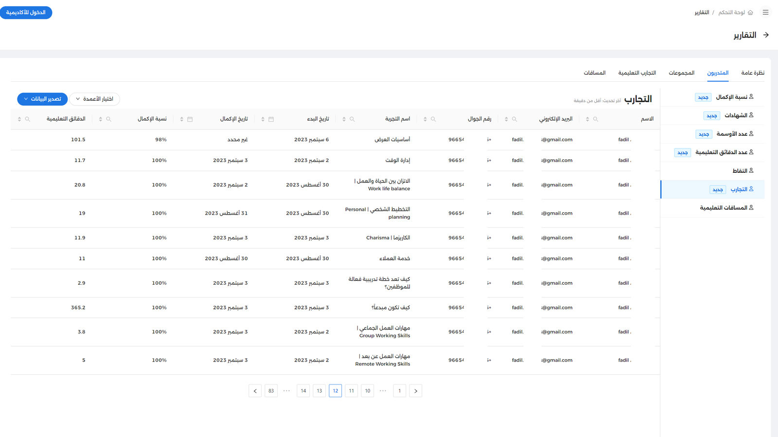 تتعدد البيانات داخل منصتك التعليمية مُحاولةً الإحاطة بالكثير من المنظومات والكيانات ذات الأهمية البالغة، فما بين بيانات تتعلق بالمتدربين أو المجموعات وأخرى تتعلق بالتجارب أو المساقات؛ فضلاً عن تلك العلاقات المتشابكة التي تجمع بين كيانين أو أكثر في علاقة معقدة ومتشعبة، مثل علاقة المتدرب مع تجربة تعليمية أو عدة تجارب، أو علاقة المجموعة بنسبة إكمال مساقٍ ما، وهكذا.. ومن هنا بزغت ضرورة إيجاد حلٍ شامل ومرن لاحتواء تلك العلاقات وبلورة البيانات بشكلٍ مناسب ووافٍ. تجد في صفحة التقارير الجديدة داخل لوحة تحكم أكاديميتك عدة تصنيفات تتبعها عدة جداول، والتصنيفات الحالية تتمثل في: المتدربون، المجموعات، التجارب، المساقات. وتحت كل تصنيف من تلك التصنيفات تندرج عدة جداول لاستيعاب كافة البيانات والعلاقات التي تتبع لكل تصنيف.