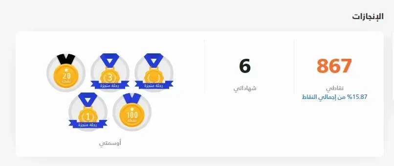 تأكد من تفعيل منظومة النقاط داخل رحلات أكاديميتك ليشعر المتدرب أنه يحصد ثمار جهده وتقدمه داخل التجربة التعليمية، كذلك قم بإسناد بعض الأوسمة داخل برنامجك التدريبي لتكافيئ المتدرب متى ما قام بتصرفٍ حميد داخل تجربته التعليمية (مثل: التفاعل مع أقرانه بالمجتمع التعليمي، الإجابة التفصيلية على سؤال تفاعلي، المداومة على الدخول للأكاديمية، وهكذا…) كما يمكنك إسناد بعض الشهادات على نسب إكمال محددة من البرنامج التدريبي ليوثق الموظف إنجازه وتقدمه داخل برامج الشركة التدريبية.