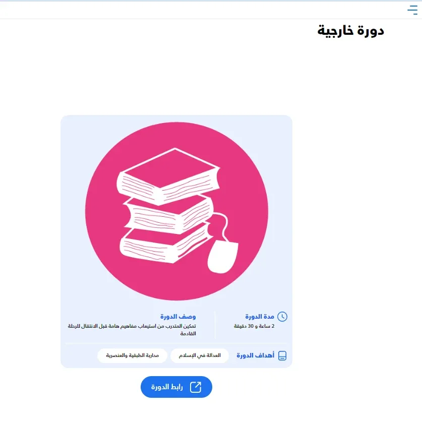 في سياق الانفتاح كذلك؛ لا يمكن حصر المصادر التعليمية أبدًا في إطار مصدر واحد فقط، ولا يمكننا أن نجبر مقدم التجربة التعليمية على تقديم كل المعلومات والمحتويات التعليمية في إطار الرحلات التعليمية والمحطات وما إلى آخره من فلسفة منتج إلهام في التجربة التعليمية، فقد تكون هناك معلومات ومحتويات شديدة التخصص وبالغة التعقيد ويجب تقديمها بشكلٍ محدد في مصدر آخر خارجي، لذلك قمنا بتزويد مكتبة المكونات التفاعلية لدينا بمكون تفاعلي جديد: ألا وهو مكون الدورة الخارجية، فيمكنك من خلال هذا المكون من تضمين رابط دورة خارجية محددة داخل الرحلة التعليمية ليتم إحالة المتدرب إليها.