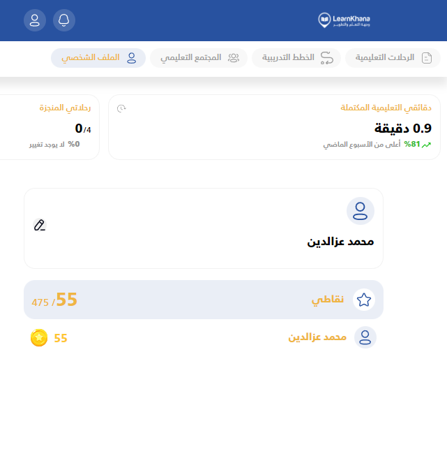 كما تتواجد قيمة النقاط المحصلة من طرف المتدرب داخل ملفه الشخصي، ويتم عرض تلك القيمة مقارنةً بإجمالي النقاط التي كان بالإمكان تحصيلها والمتاحة أمامه بالأكاديمية، كما في الصورة التالية